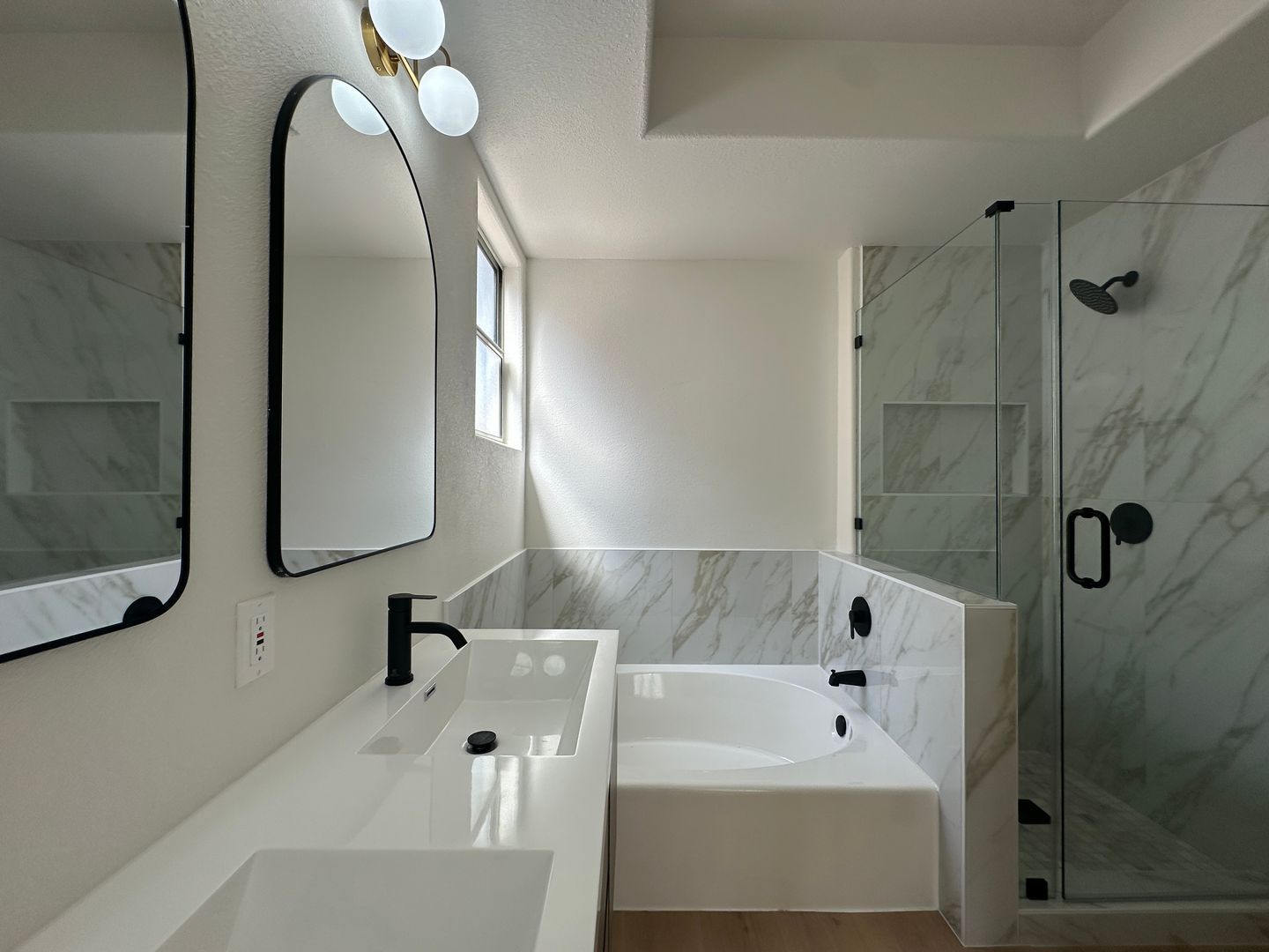 Enjoy this beautifully remodeled single-story home featuring 3 bedrooms, inviting curb appeal with a custom paver driveway, and a spacious backyard complete with an in-ground pool. The interior is filled with abundant natural light and offers high ceilings with ceiling fans, recessed lighting, a custom tiled fireplace, modern light fixtures, plush carpet, and laminate wood flooring throughout. The customary kitchen features a small breakfast bar with seating, floating shelves, a separate dining area, recessed lighting, stylish countertops, cabinetry with gold hardware, and stainless steel appliances. Spa-inspired bathrooms showcase floating vanities with framed mirrors, custom lighting, modern tiled showers with built-in niches and rainfall shower heads, plus a separate soaking tub in the primary bathroom. Move-in Ready.