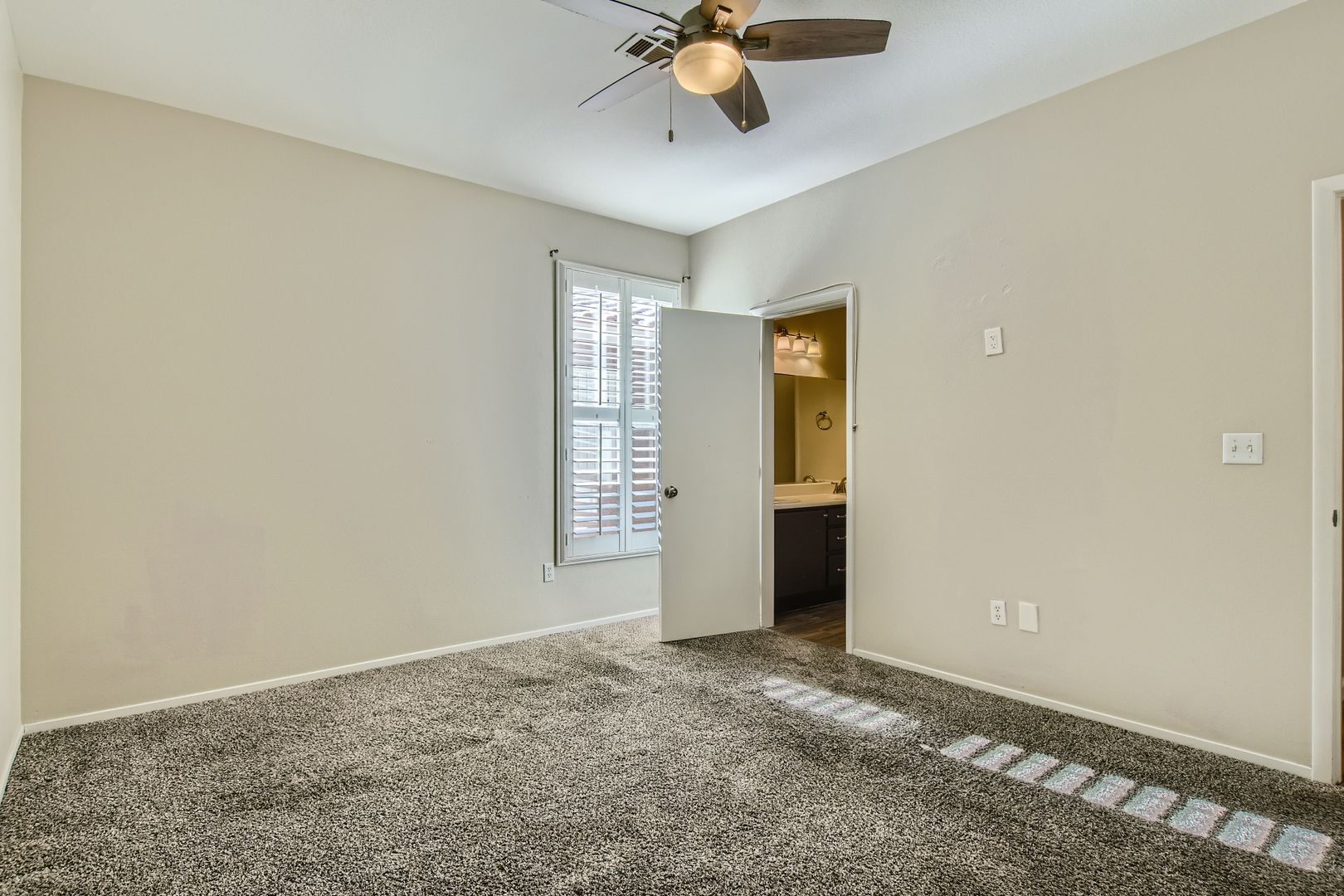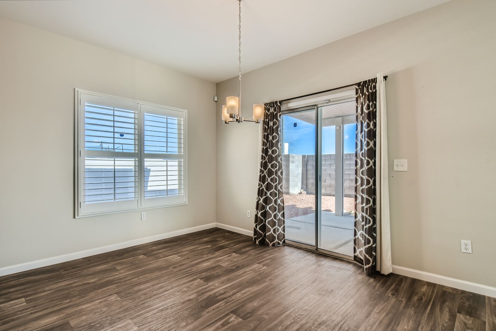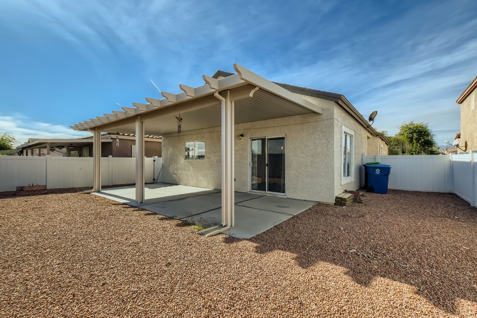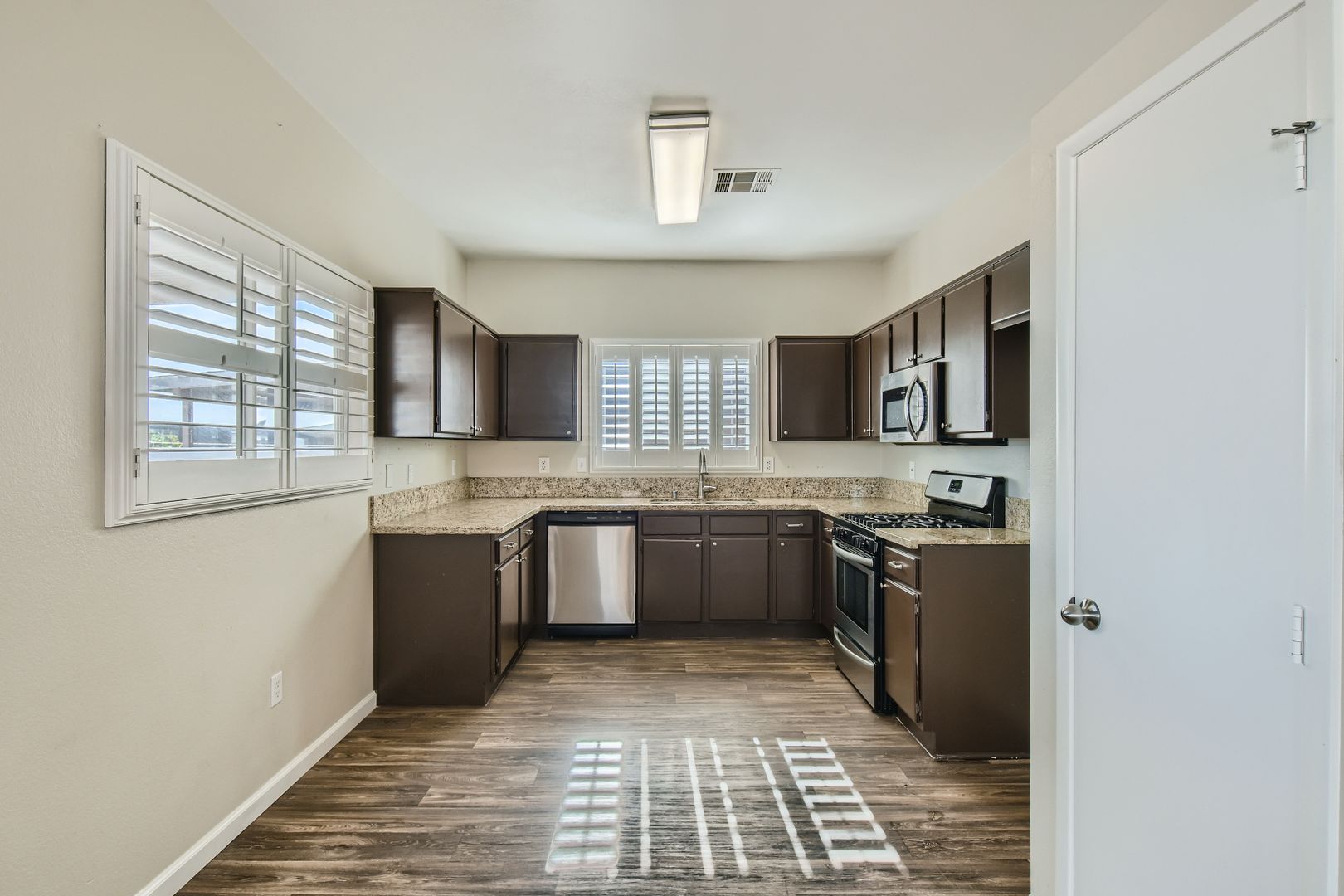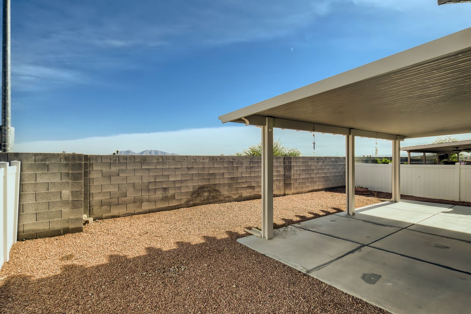 Come step inside your cute new SINGLE STORY home and enjoy the several UPDATES your future home has to offer. Pretty vinyl planking through the main living area and kitchen with newer carpet in the bedrooms. Newer paint throughout the home with GORGEOUS SHUTTERS on ALL the windows. Kitchen has GRANITE COUNTERTOPS and STAINLESS STEEL appliances. Primary bedroom and living room has stylish CEILING FANS with lights to help keep your home cool in the warmer months. Primary bedroom has adjoining bathroom with a dual sink vanity and large walk-in closet. Relax under your contemporary full-length LUXURY PATIO COVER in your backyard while you enjoy the mountain views with NO NEIGHBORS BEHIND you. ALARM SYSTEM already in place for your extra safety and security. Security door to bring fresh air in while keeping your home secure. Hassle-free living with NO HOA to contend with and without the extra monthly expense. This property is ready for you to make it your new HOME SWEET HOME!