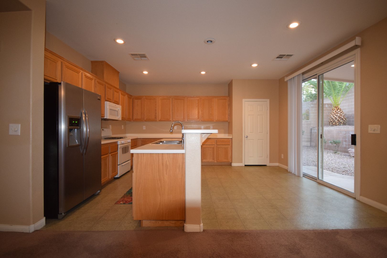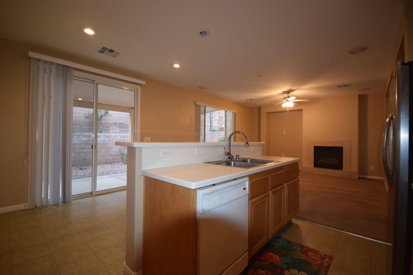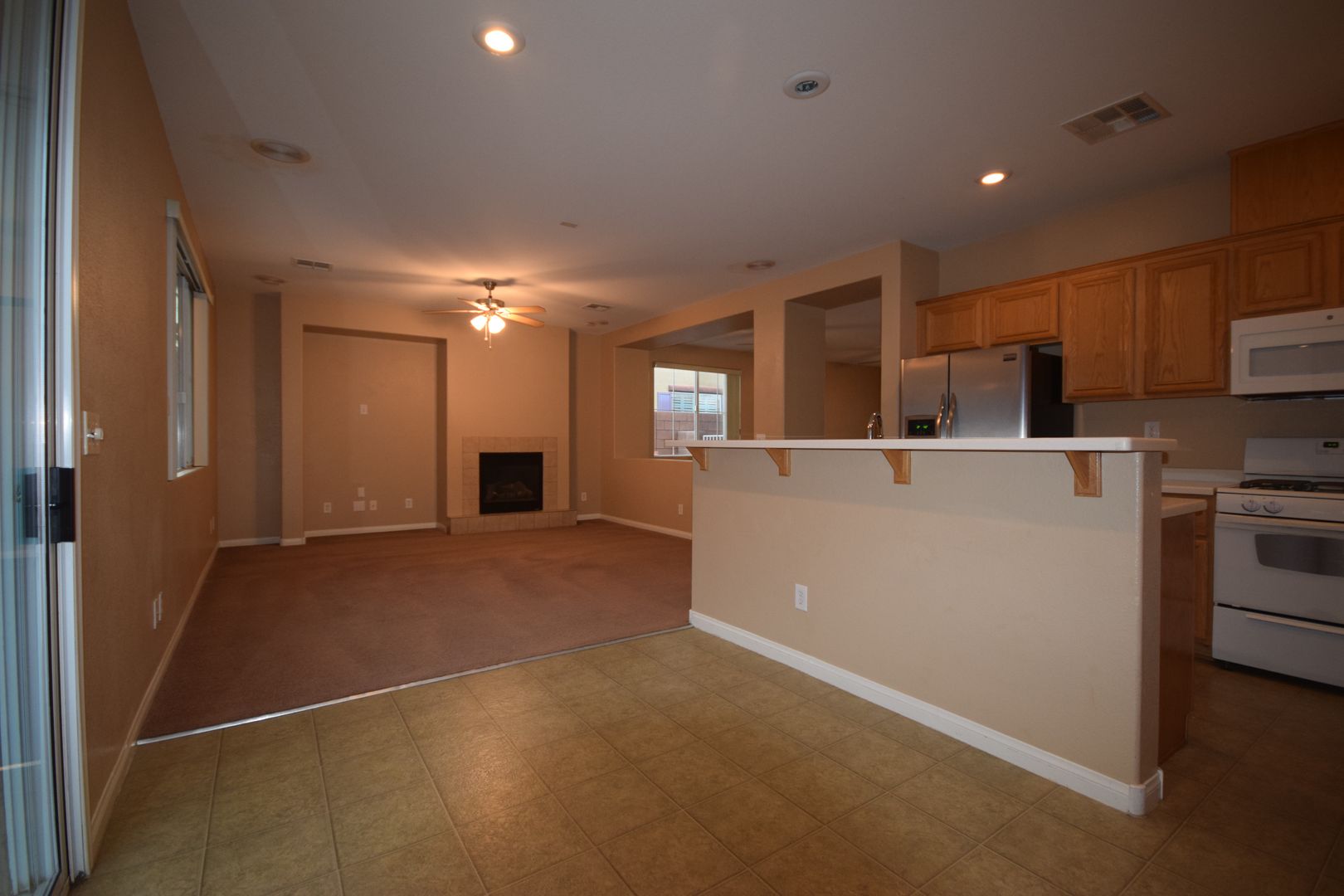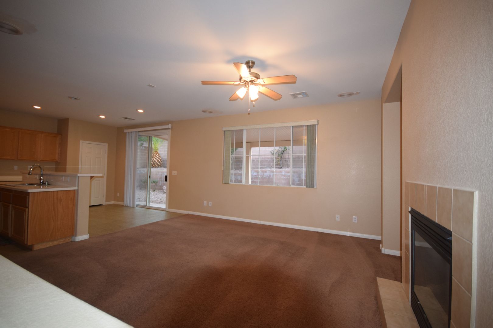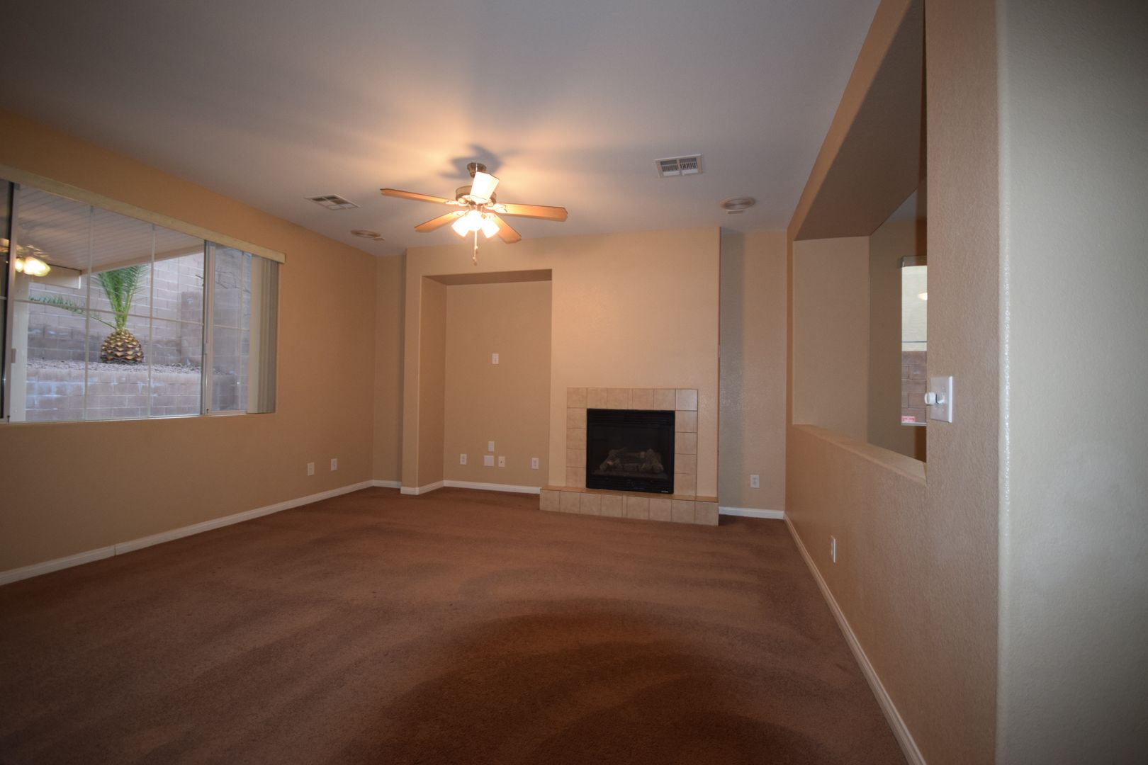 Attached 3 car garage; tiled entry/foyer; carpet flooring throughout except for the wet areas; eat in kitchen with tile flooring, pantry, island, solid surface counter-tops, breakfast bar; formal dining area; formal living room; separate family room with fireplace and media niche; spacious upstairs loft; master bedroom on the first floor with walk in closet; master bath with double sinks, large shower, garden tub; secondary bedrooms on the second floor (one with walk in closet); laundry room on the first floor; private backyard with covered patio and desert landscaping. TENANT PAYS $22 PER MONTH FOR TRASH.