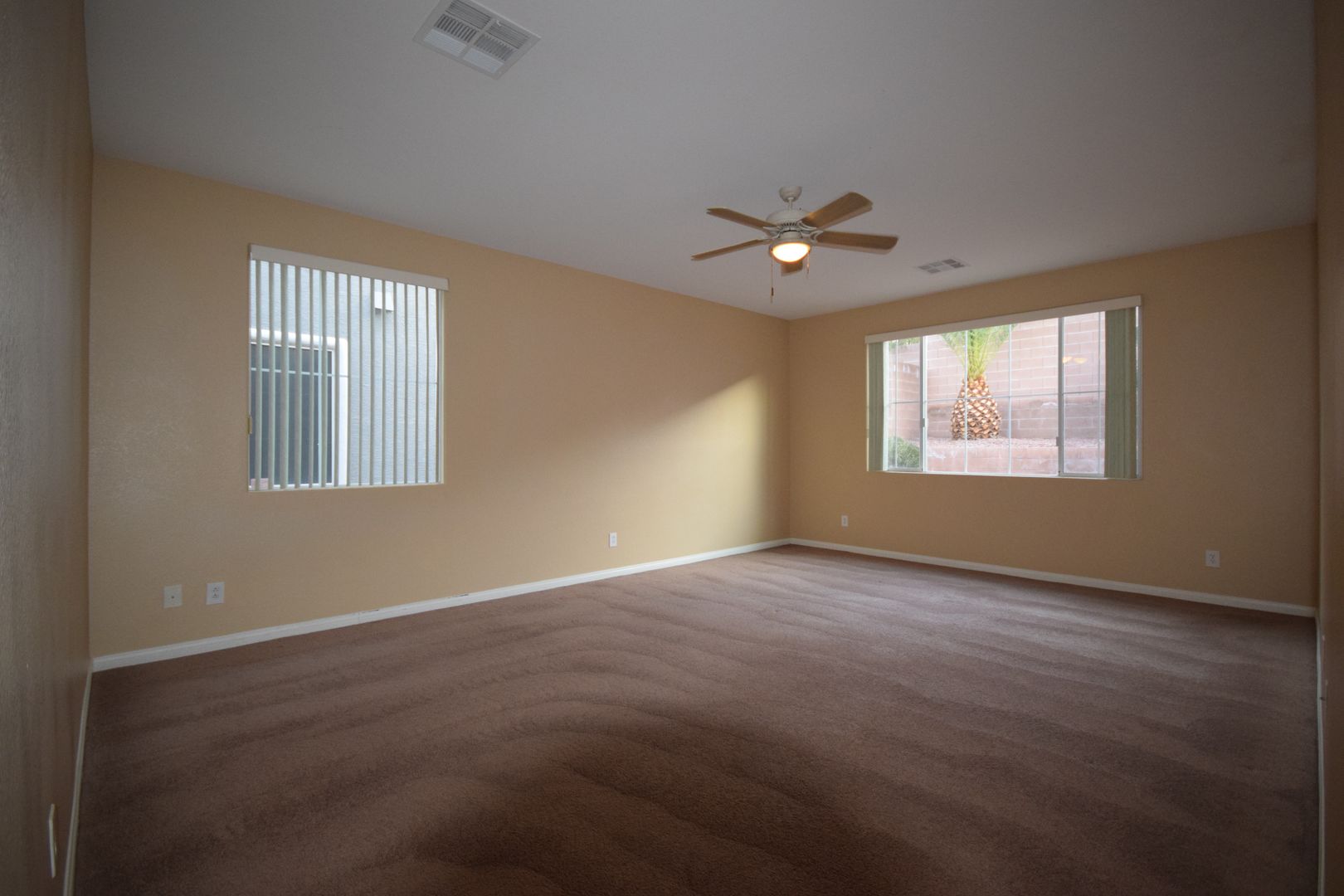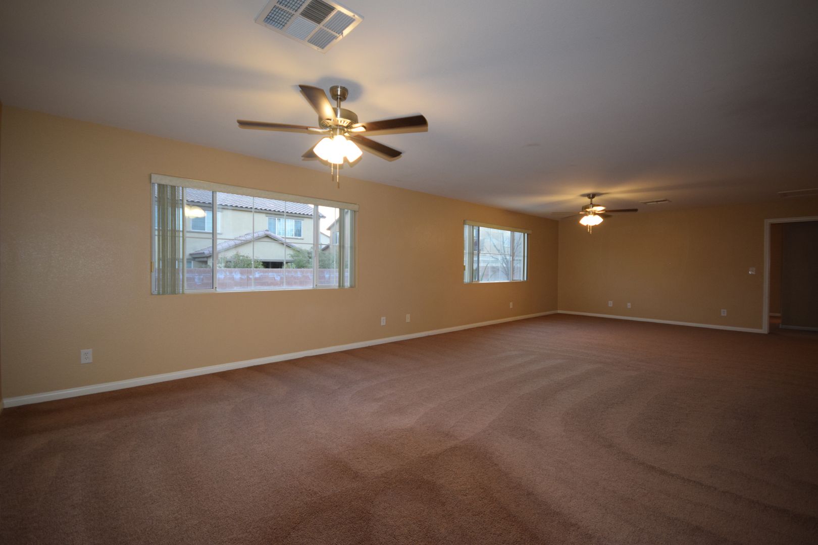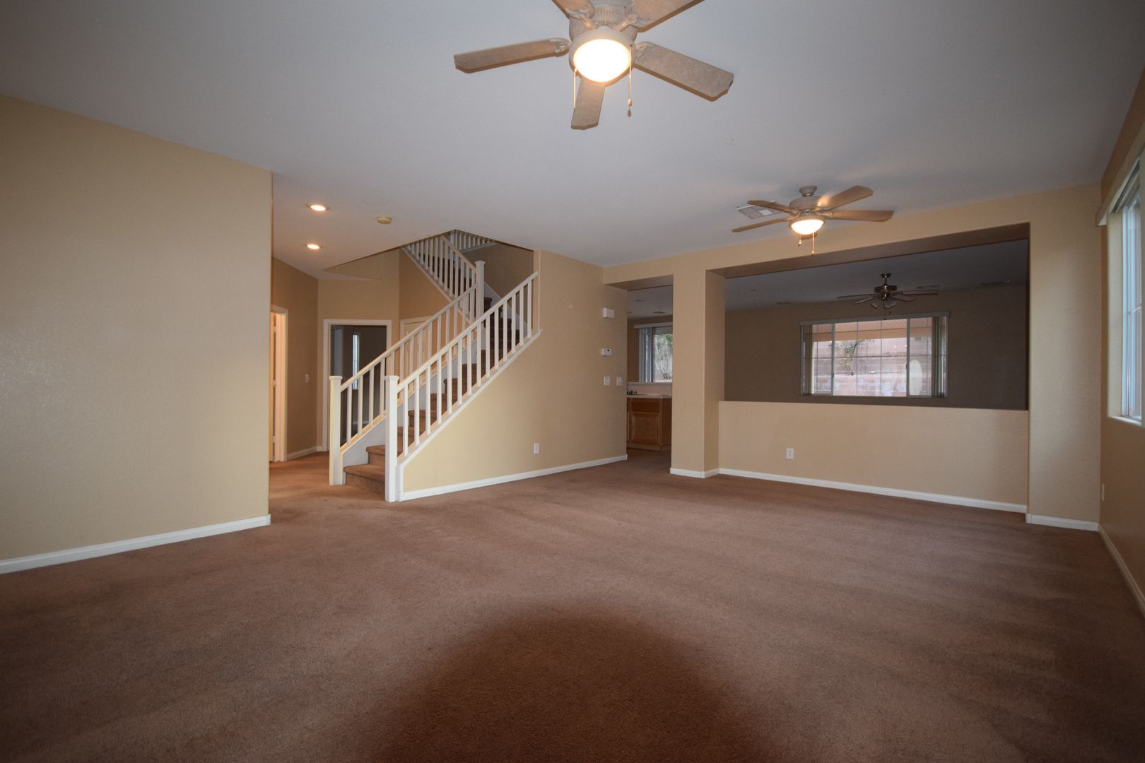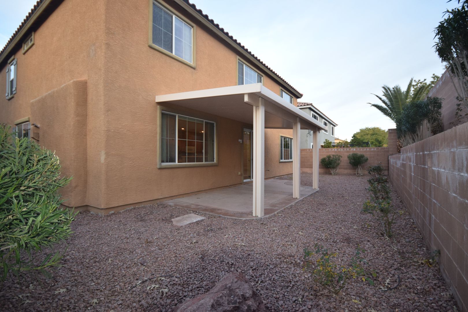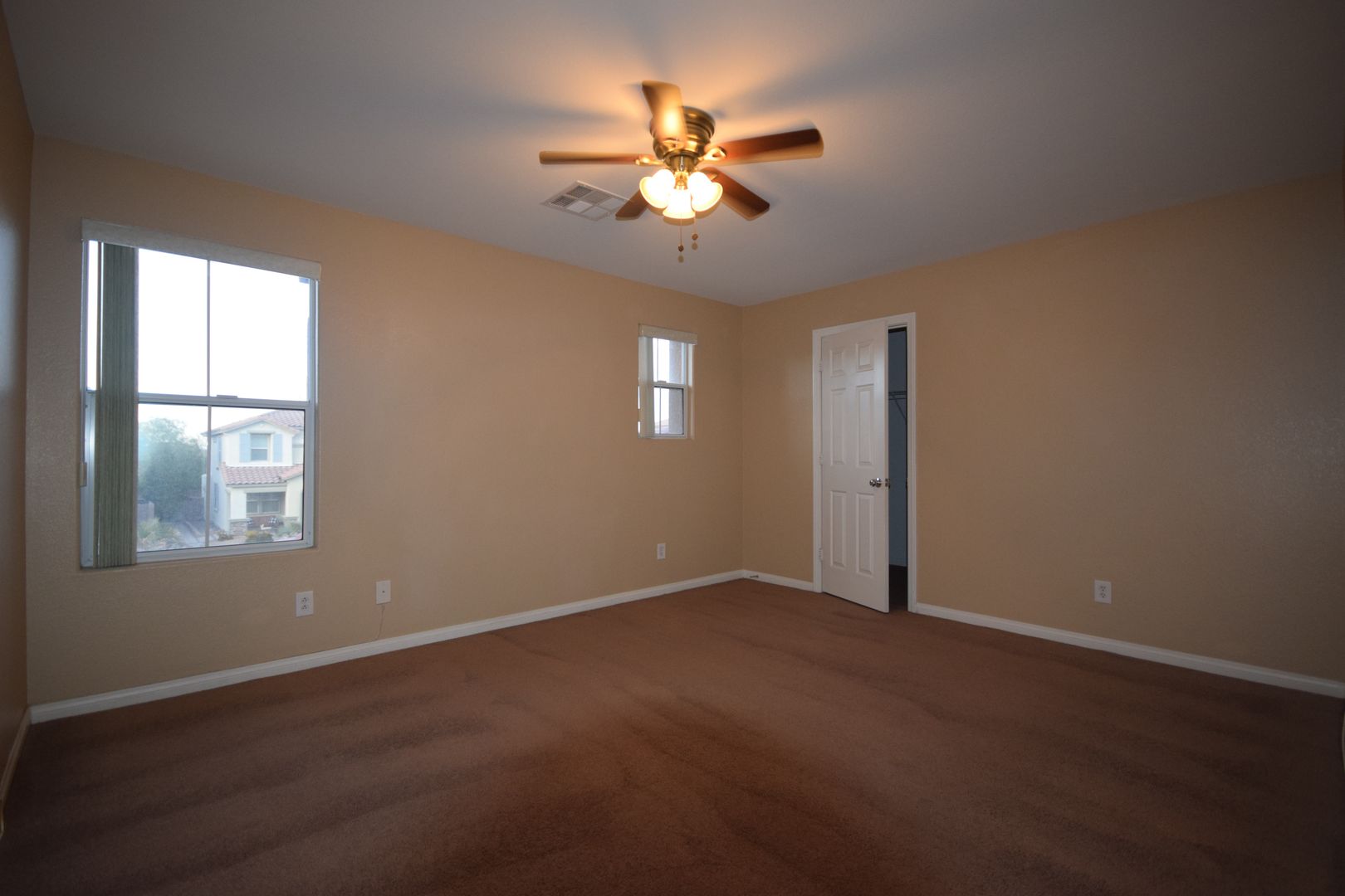 Attached 3 car garage; tiled entry/foyer; carpet flooring throughout except for the wet areas; eat in kitchen with tile flooring, pantry, island, solid surface counter-tops, breakfast bar; formal dining area; formal living room; separate family room with fireplace and media niche; spacious upstairs loft; master bedroom on the first floor with walk in closet; master bath with double sinks, large shower, garden tub; secondary bedrooms on the second floor (one with walk in closet); laundry room on the first floor; private backyard with covered patio and desert landscaping. TENANT PAYS $22 PER MONTH FOR TRASH.