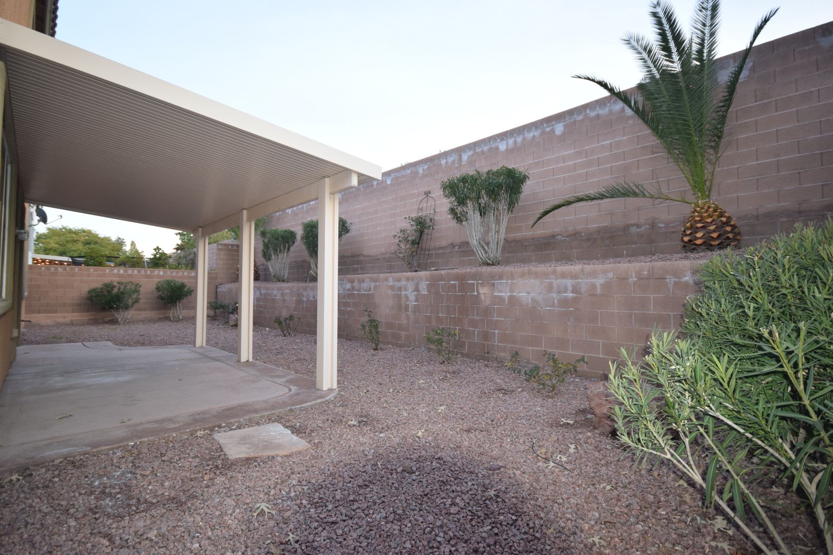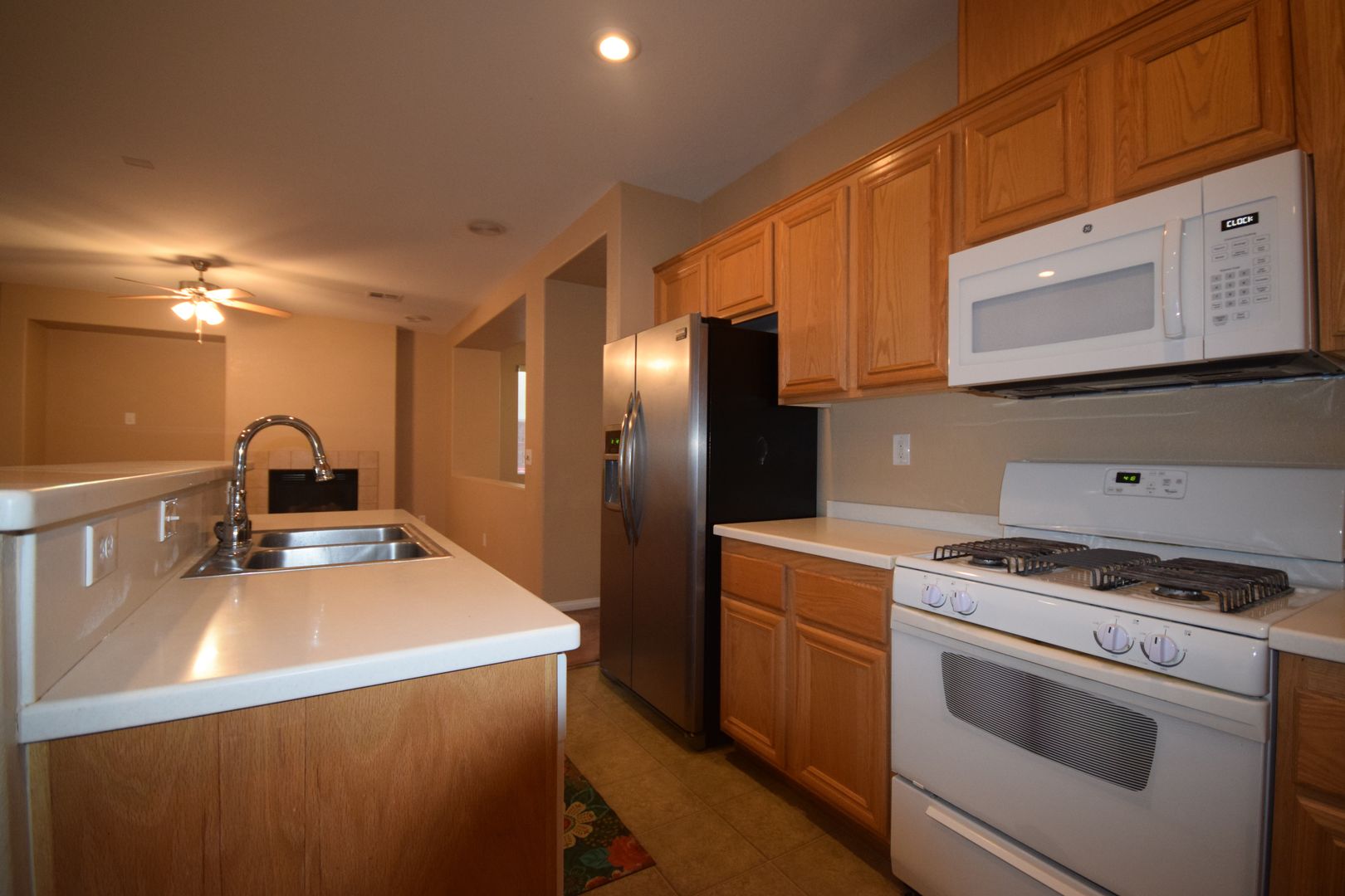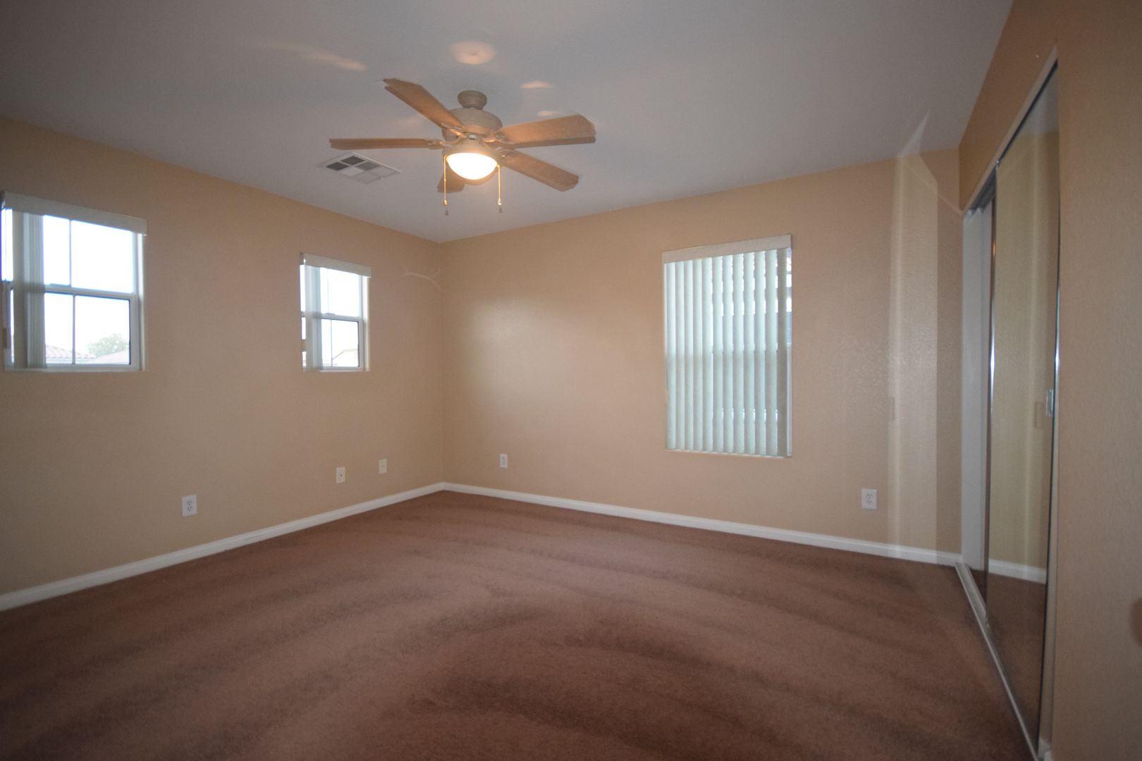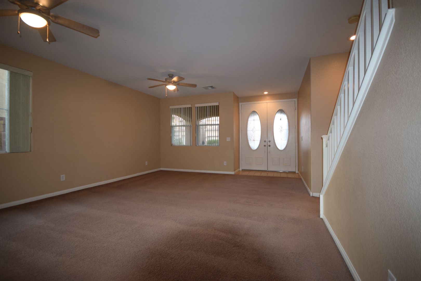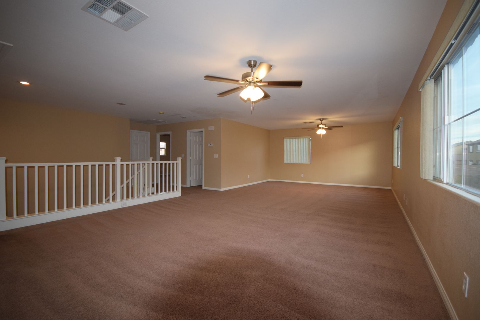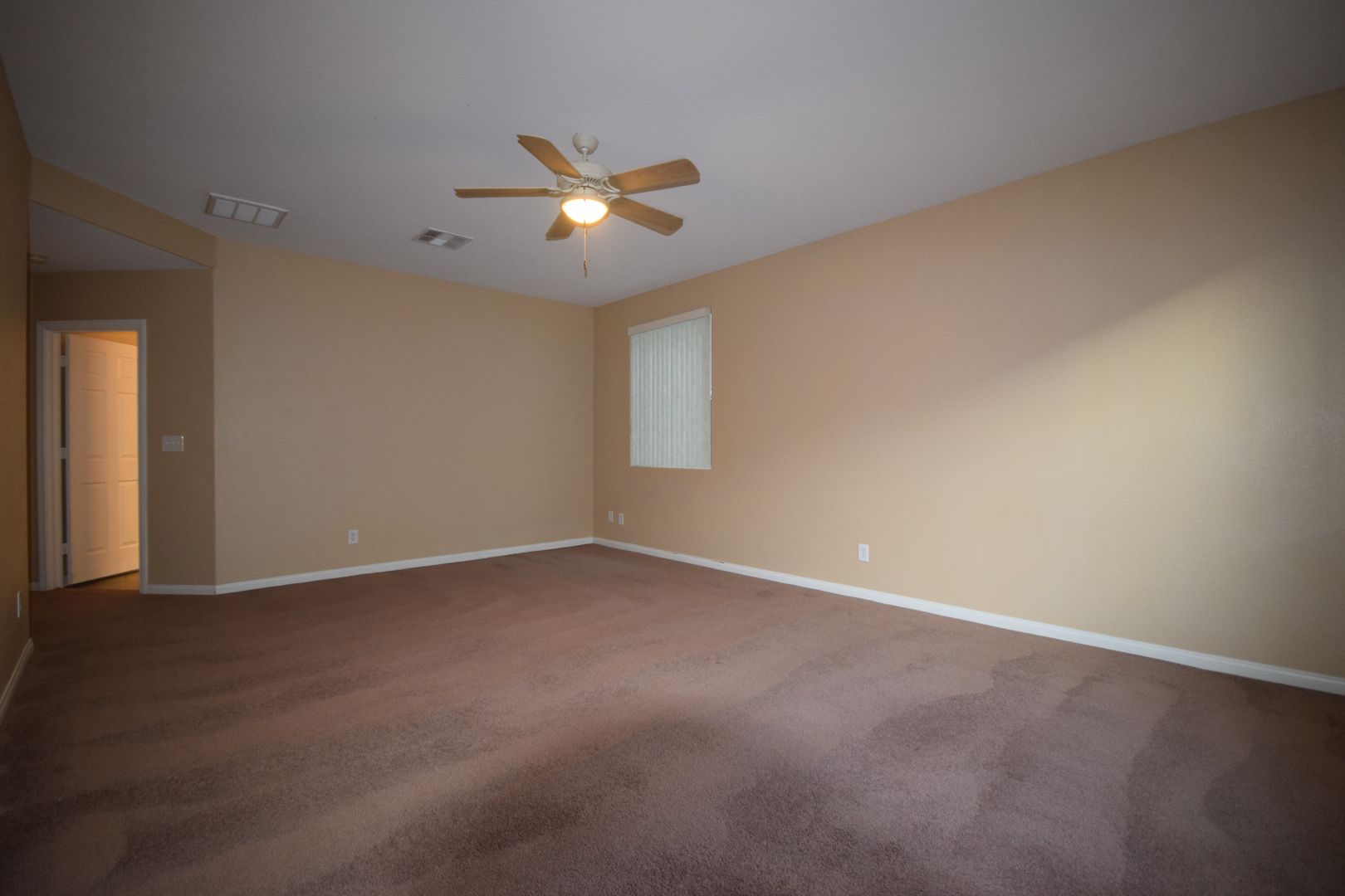 Attached 3 car garage; tiled entry/foyer; carpet flooring throughout except for the wet areas; eat in kitchen with tile flooring, pantry, island, solid surface counter-tops, breakfast bar; formal dining area; formal living room; separate family room with fireplace and media niche; spacious upstairs loft; master bedroom on the first floor with walk in closet; master bath with double sinks, large shower, garden tub; secondary bedrooms on the second floor (one with walk in closet); laundry room on the first floor; private backyard with covered patio and desert landscaping. TENANT PAYS $22 PER MONTH FOR TRASH.
