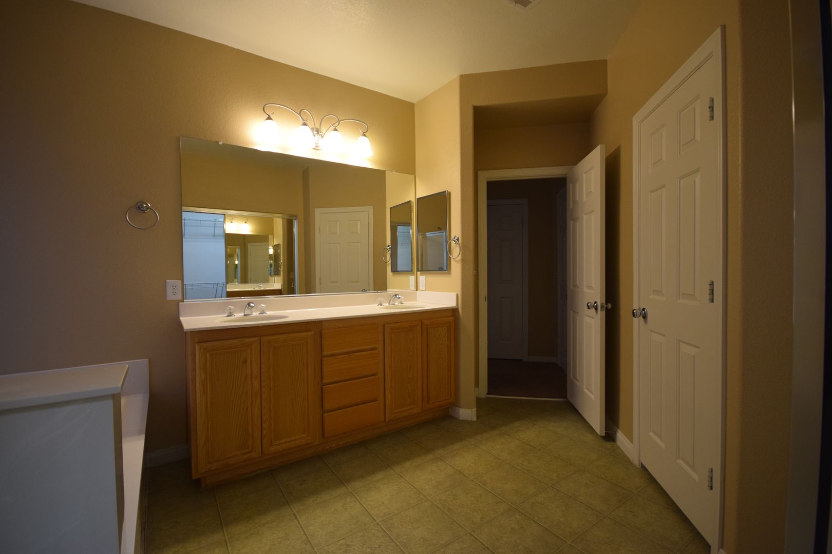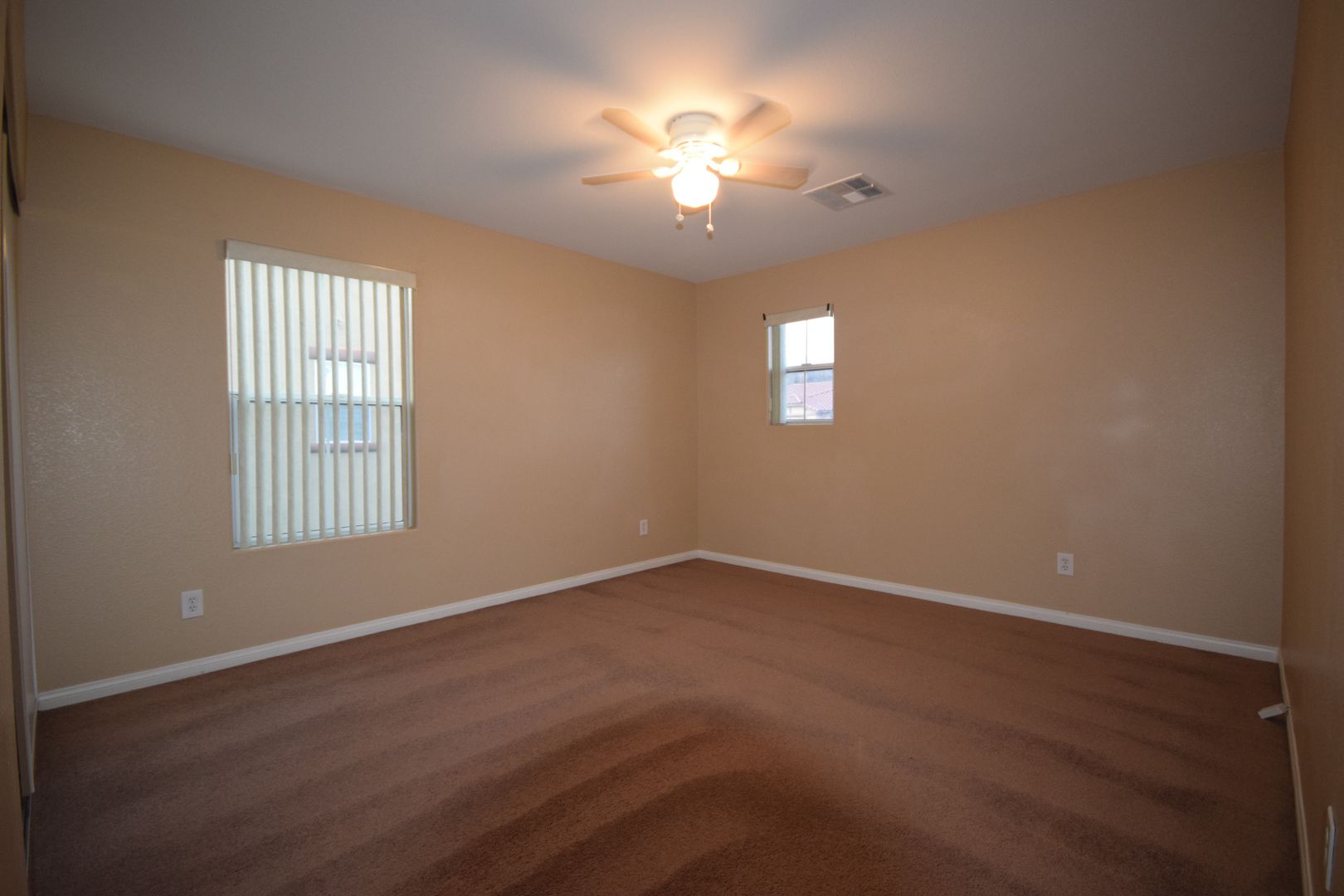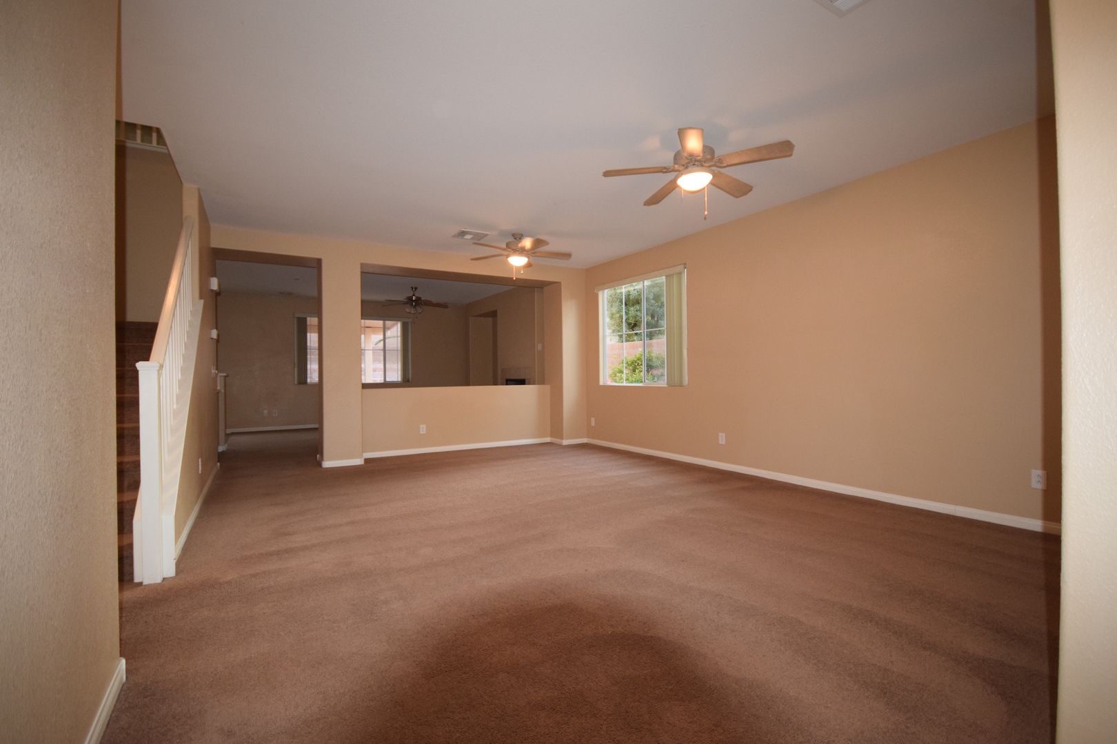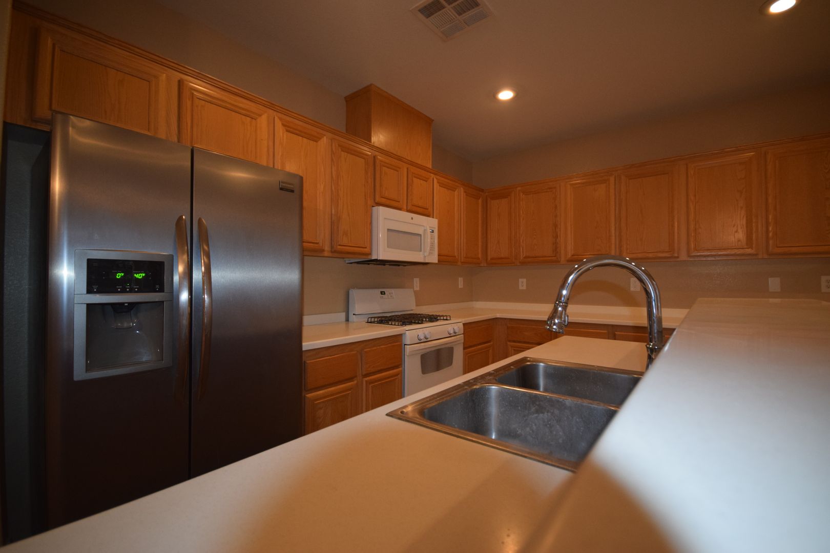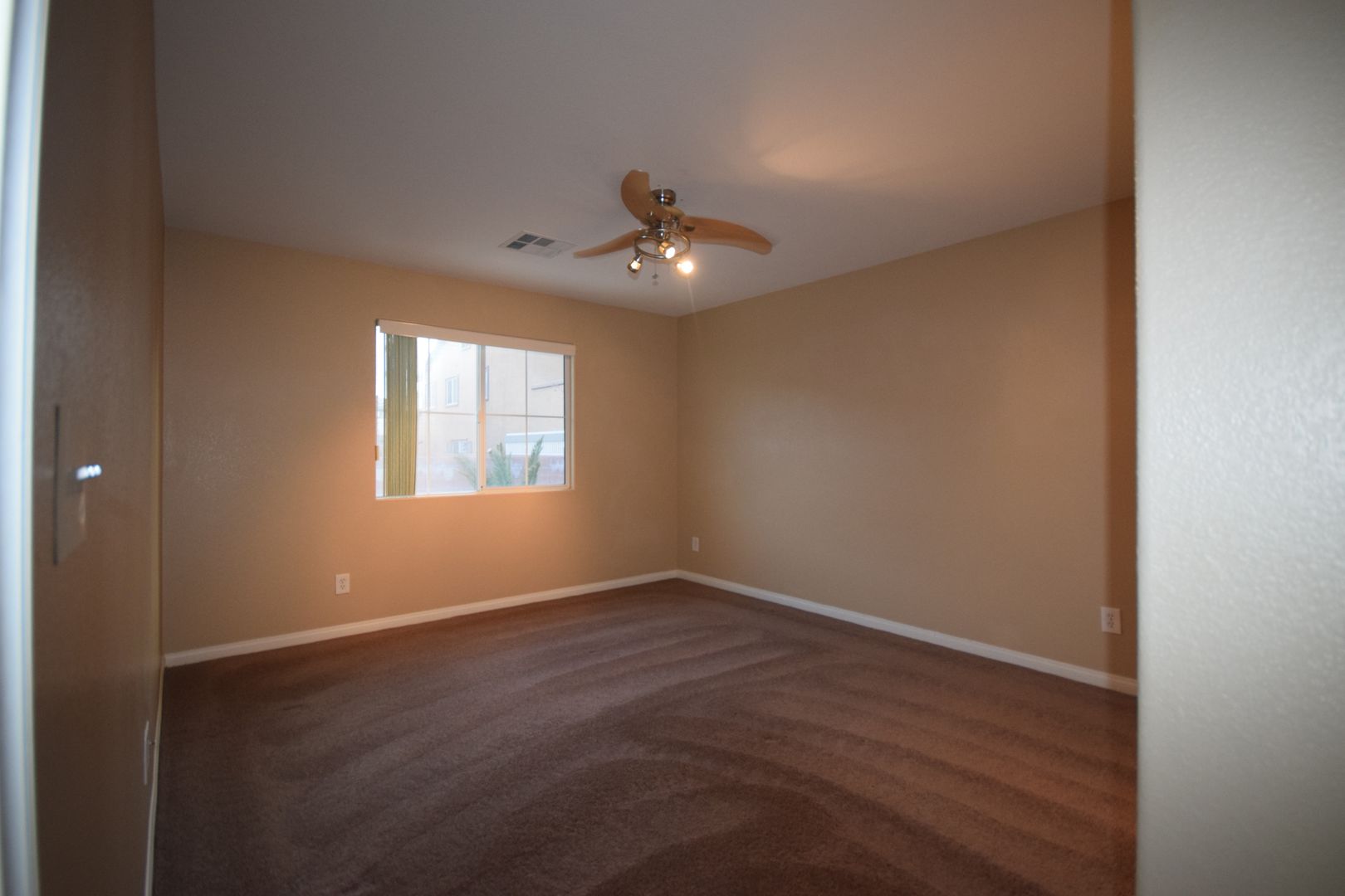 Attached 3 car garage; tiled entry/foyer; carpet flooring throughout except for the wet areas; eat in kitchen with tile flooring, pantry, island, solid surface counter-tops, breakfast bar; formal dining area; formal living room; separate family room with fireplace and media niche; spacious upstairs loft; master bedroom on the first floor with walk in closet; master bath with double sinks, large shower, garden tub; secondary bedrooms on the second floor (one with walk in closet); laundry room on the first floor; private backyard with covered patio and desert landscaping. TENANT PAYS $22 PER MONTH FOR TRASH.